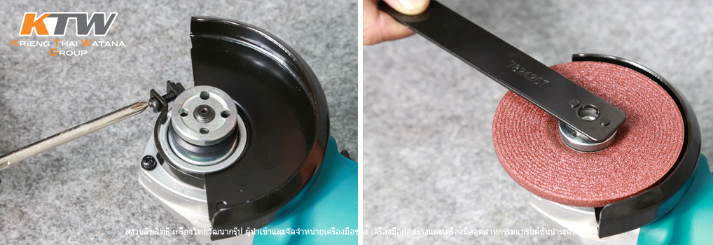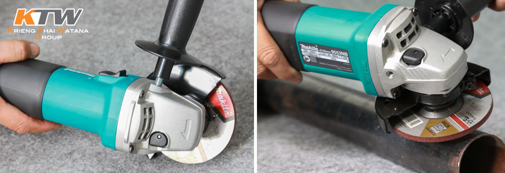 - ล็อคใบเจียโดยใช้ประแจที่มาพร้อมกับตัวเครื่อง โดยใช้นิ้วกดปุ่มล็อคเฟืองแล้วใช้ประแจหมุนล็อคใบให้แน่น โดยออกแรงพอประมาณ