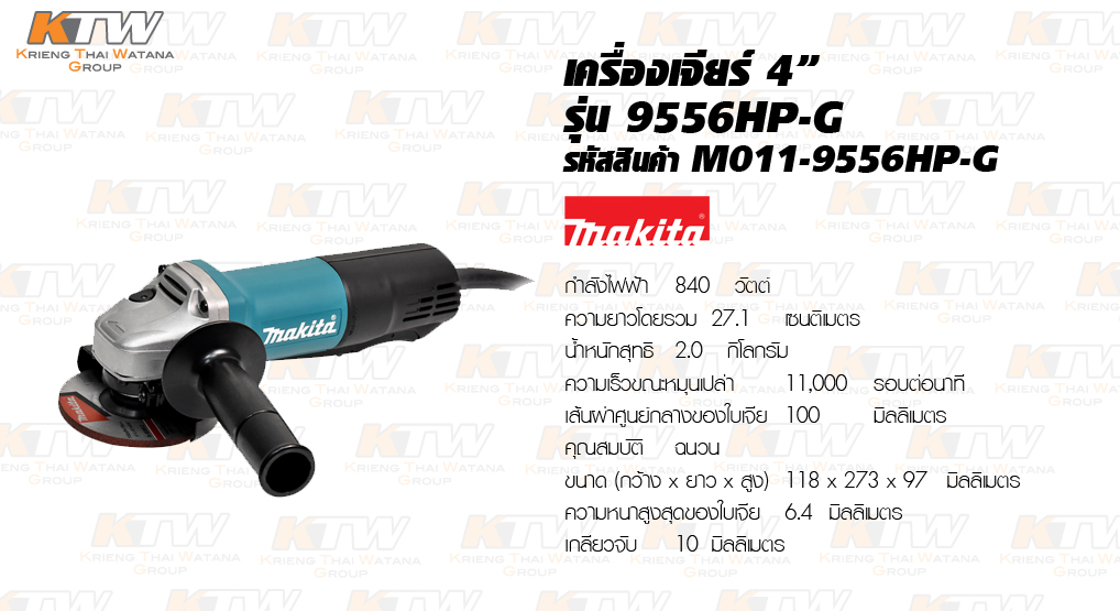 เครื่องเจียร์ 4” MAKITA รุ่น 9556HP-G ใช้งานร่วมกับใบเจียร์ขนาด 4 นิ้ว ซึ่งผู้ใช้งานเครื่องมือควรมีอุปกรณ์ป้องกันความปลอดภัย เช่น ถุงมือหนัง แว่นตานิรภัย เป็นต้น เหมาะสำหรับงานตัด หรืองานเจียร์ ขัดผิวโลหะ เจียร์ลบมุม เป็นต้น