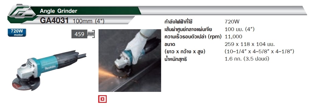 เครื่องเจียร์ 4” SLIM สวิทซ์หลัง MAKITA รุ่น GA4031 ใช้งานร่วมกับใบเจียร์ขนาด 4 นิ้ว ซึ่งผู้ใช้งานเครื่องมือควรมีอุปกรณ์ป้องกันความปลอดภัย เช่น ถุงมือหนัง แว่นตานิรภัย เป็นต้น เหมาะสำหรับงานตัด หรืองานเจียร์ ขัดผิวโลหะ หรือการเจียร์ลบมุม เป็นต้น