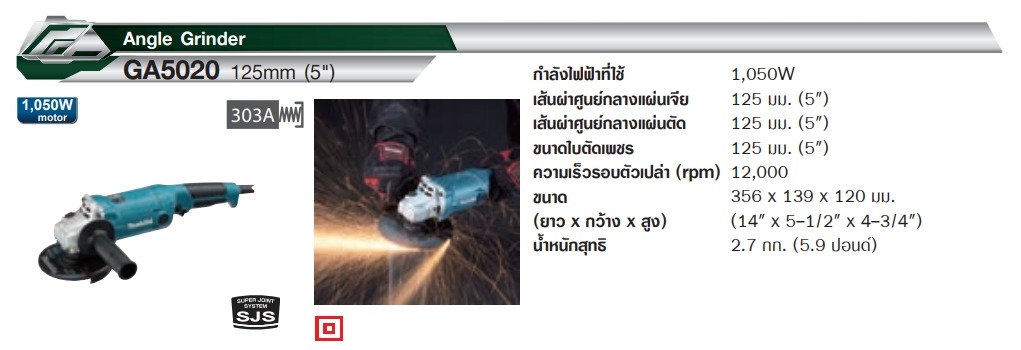 เครื่องเจีย 5 นิ้ว MAKITA รุ่น GA-5020 นอกจากการใช้งานในระบบ SJS (SUPER JOINT SYSTEM) แล้วผู้ใช้งานควรมีเครื่องมือ หรืออุปกรณ์ป้องกันความปลอดภัย เช่น ถุงมือหนัง แว่นตานิรภัย เป็นต้น เหมาะสำหรับงานตัด หรืองานเจียร์ ขัดผิวโลหะ หรือการเจียร์ลบเหลี่ยมแผ่นเหล็ก เป็นต้น