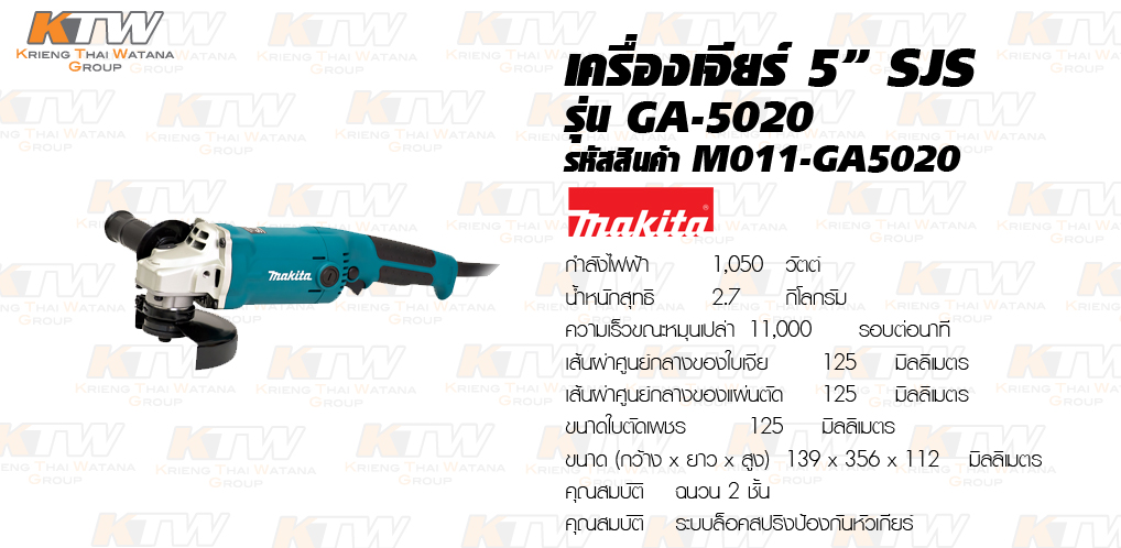 เครื่องเจีย 5 นิ้ว MAKITA รุ่น GA-5020 ตัวมอเตอร์คุณภาพสูงทำให้ไม่มีปัญหาเรื่องการระบายความร้อน ตัวเครื่องถูกออกแบบมาเพื่อป้องกันฝุ่นละอองเข้าไปในตัวเครื่อง มีขนาดบาง และมีความทนทานสูง ใช้สวิทซ์เปิด - ปิดสะดวกในการใช้งาน ใช้ระบบ SJS (SUPER JOINT SYSTEM) ระบบล็อคสปริงป้องกันหัวเกียร์ เหมาะสำหรับงานเจียร์พื้นผิวโลหะ หรือขัดผิว และใช้งานงานตัด โดยจะต้องเลือกขนาดใบให้เหมาะสมกับงานที่ใช้ ความเร็วรอบ 11,000 รอบต่อนาที มีน้ำหนักรวม 2.7 กิโลกรัม มีฉนวนแบบ 2 ชั้นเพื่อป้องกันอันตรายที่เกิดจากไฟรั่ว ใช้กับถ่าน CB-303A