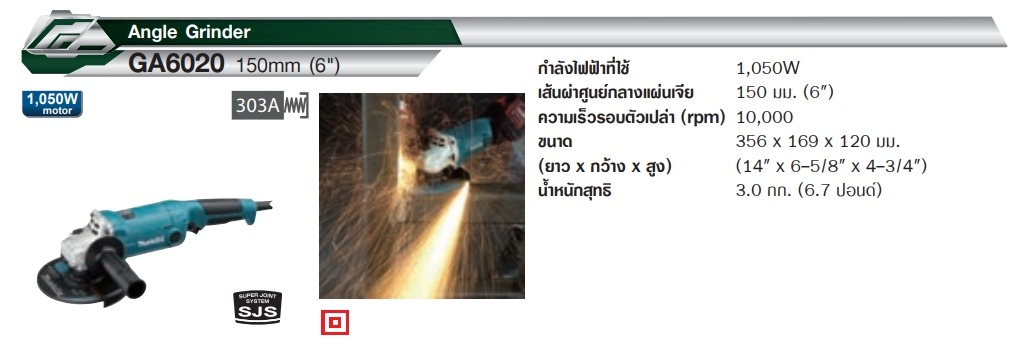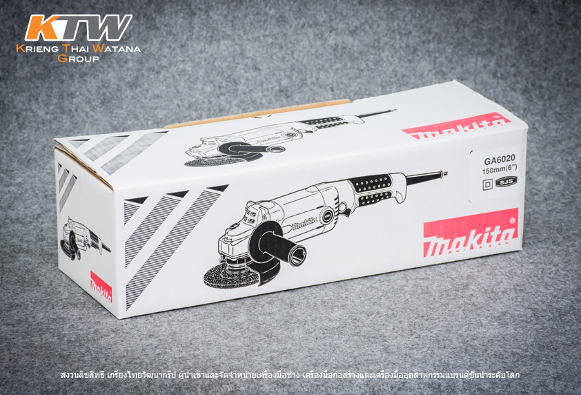 เครื่องเจียไฟฟ้า 6 นิ้ว MAKITA รุ่น GA-6020 เสื้อเครื่อง และด้ามข้างช่วยจับถนัดมือมากขึ้น มีกำลังไฟฟ้า 1,050 วัตต์ เส้นผ่าศูนย์กลางใบเจียร์ 150 มิลลิเมตร เส้นผ่าศูนย์กลางแผนขัด 150 มิลลิเมตร เส้นผ่าศูนย์กลางใบตัดเพชร 150 มิลลิเมตร ใช้ระบบ SJS (SUPER JOINT SYSTEM) มีความเร็วรอบตัวเปล่า 10,000 รอบต่อนาที น้ำหนักสุทธิ 3.0 กิโลกรัม มีฉนวนแบบ 2 ชั้นเพื่อป้องกันอันตรายที่เกิดจากไฟรั่ว ใช้กับถ่าน CB-303A