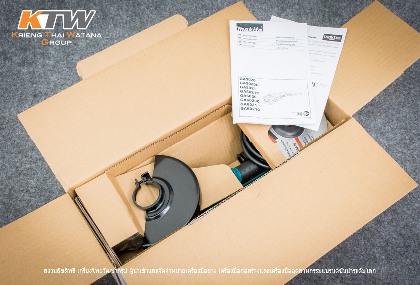 เครื่องเจีย 6 นิ้ว MAKITA รุ่น GA-6020 บรรจุในกล่องกระดาษแข็งอย่างดี กล่องด้านนอกมีรูปสินค้าชัดเจน รับประกันคุณภาพด้วยโลโก้แบรนด์ MAKITA สีแดง มองเห็นได้เด่นชัด