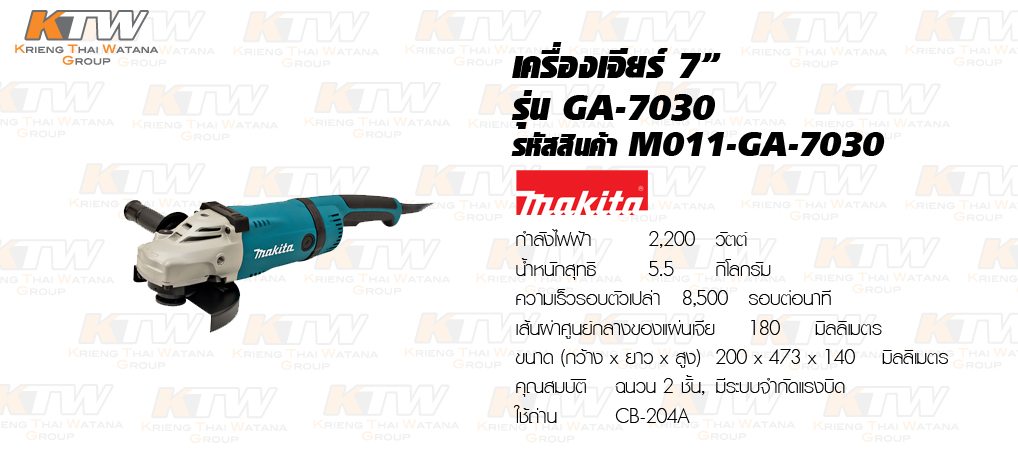 เครื่องเจีย 7 นิ้ว MAKITA รุ่น GA-7030 ตัวมอเตอร์คุณภาพสูงทำให้ไม่มีปัญหาเรื่องการระบายความร้อน ตัวเครื่องถูกออกแบบมาเพื่อป้องกันฝุ่นละอองเข้าไปในตัวเครื่อง มีความทนทานสูง ใช้สวิทซ์เปิด - ปิดสะดวกต่อการใช้งาน เหมาะสำหรับงานเจียร์พื้นผิวโลหะ หรือขัดผิว และใช้งานงานตัด โดยจะต้องเลือกขนาดใบให้เหมาะสมกับงานที่ใช้ ความเร็วรอบ 8,500 รอบต่อนาที มีน้ำหนักรวม 5.5 กิโลกรัม มีฉนวนแบบ 2 ชั้นเพื่อป้องกันอันตรายที่เกิดจากไฟรั่ว และระบบจำกัดแรงบิดที่กำลังไฟฟ้า 2,200 วัตต์ และใช้ถ่านรุ่น CB-204A