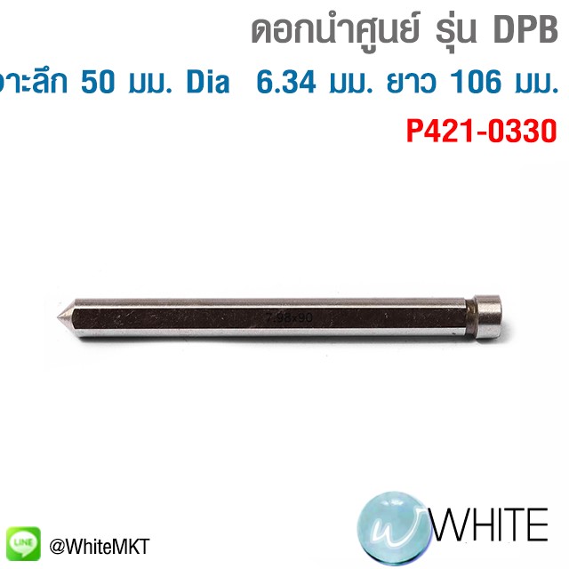 ดอกนำศูนย์ รุ่น DPB สำหรับดอกเจาะเหล็กคัตเตอร์ Jet Broach เจาะลึก 50 มม. เส้นผ่าศูนย์กลาง 6.34 มม. ความยาว 106 มม. ใช้คู่กับ ดอกเจาะเหล็กคัตเตอร์ DNTC ขนาด 12-17 มม. รุุ่น P421-0330 ยี่ห้อ POLO