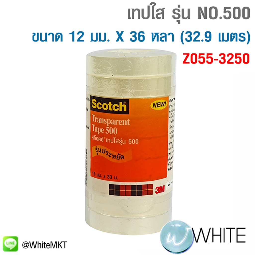 เทปใส รุ่น NO.500 ขนาด 12 มม. X 36 หลา (32.9 เมตร) แกน 1 นิ้ว เทปใสราคาประหยัด ใช้งานได้ทั่วไป เนื้อกาวอะครีลิค ติดแน่น ไม่เยิ้มซึมออกรอบม้วน เนื้อเทปโอพีพี เหนียว (9 ม้วน/แพ็ค) (3 เอ็ม) รุุ่น Z055-3250 ยี่ห้อ 3M