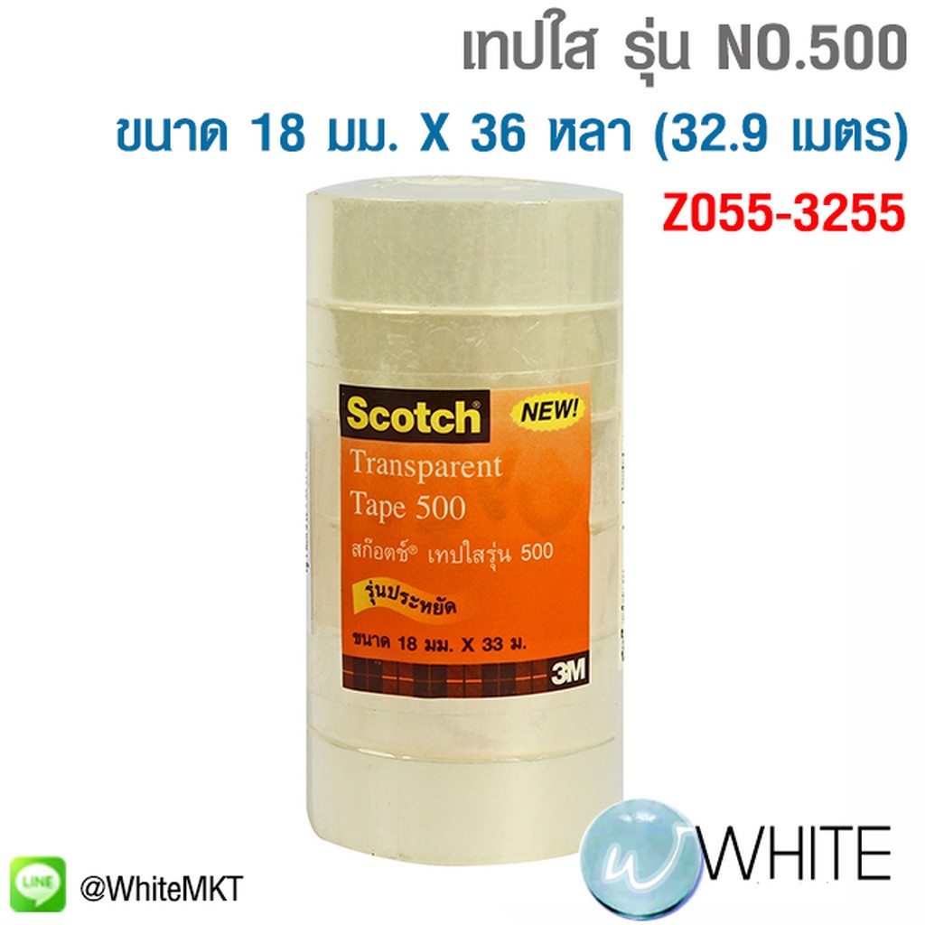 เทปใส รุ่น NO.500 ขนาด 18 มม. X 36 หลา (32.9 เมตร) แกน 1 นิ้ว เทปใสราคาประหยัด ใช้งานได้ทั่วไป เนื้อกาวอะครีลิค ติดแน่น ไม่เยิ้มซึมออกรอบม้วน เนื้อเทปโอพีพี เหนียว (10 ม้วน/แพ็ค) (3 เอ็ม) รุุ่น Z055-3255 ยี่ห้อ 3M