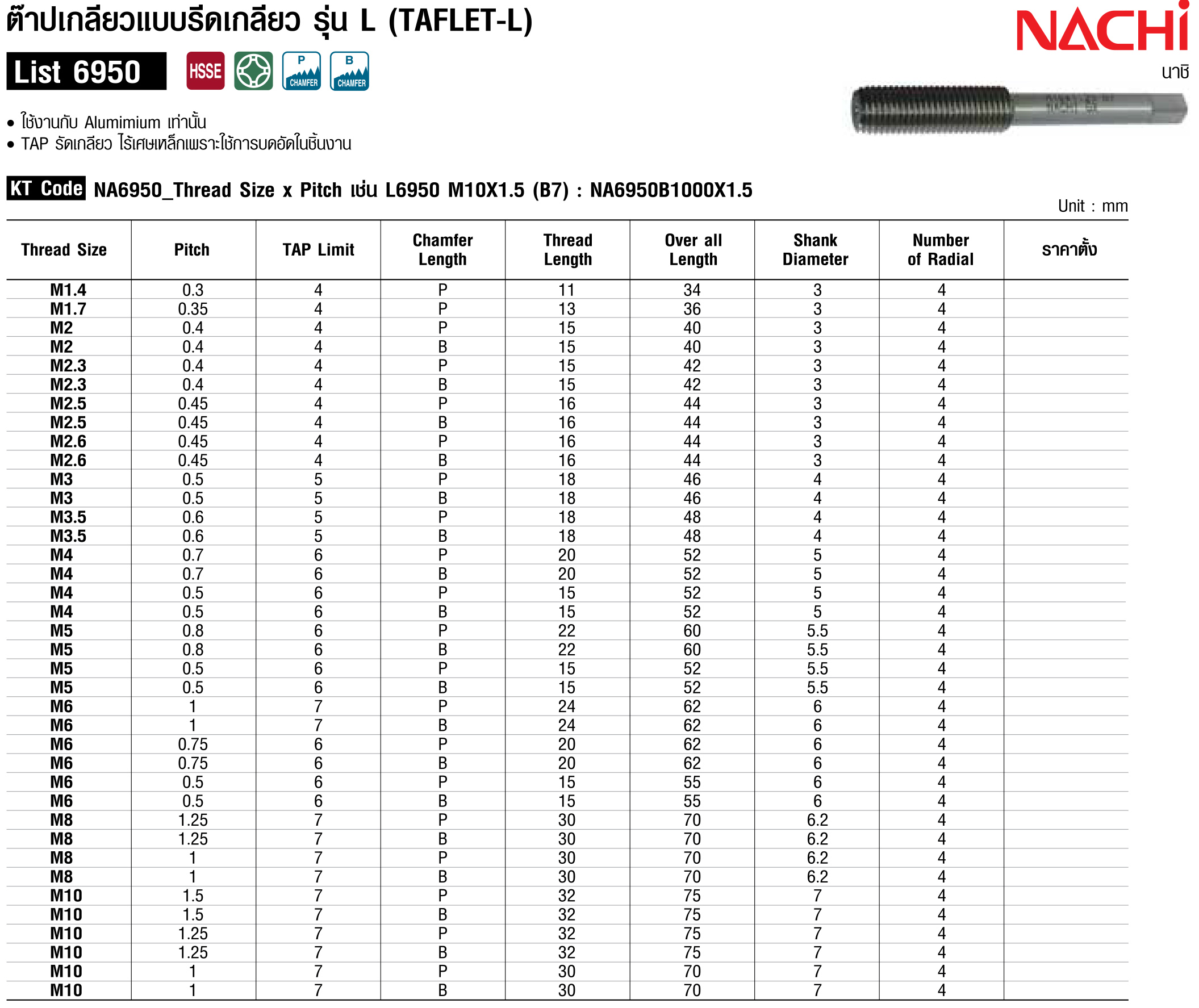 ต๊าบเกลียวแบบรีดเกลียว รุ่น L ขนาด M10.0X1.5 List 6950 รุ่น NA6950B1000X1.5 ยี่ห้อ NACHI