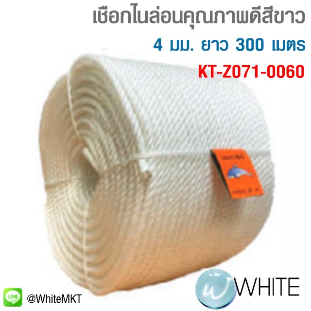 เชือกไนล่อนคุณภาพดีสีขาว ตรา โลมา (A) ขนาด 4 มม. 1 ม้วนมีความยาว 300 เมตร ผลิตจากโพลีเอททีลีน ชนิดความหนาแน่นสูง (HDPE) เหนียว ยืดหยุ่น แข็งแรง เบา ลอยน้ำได้ และทนต่อสารเคมีเกือบทุกชนิด รุุ่น KT-Z071-0060 ยี่ห้อ KT