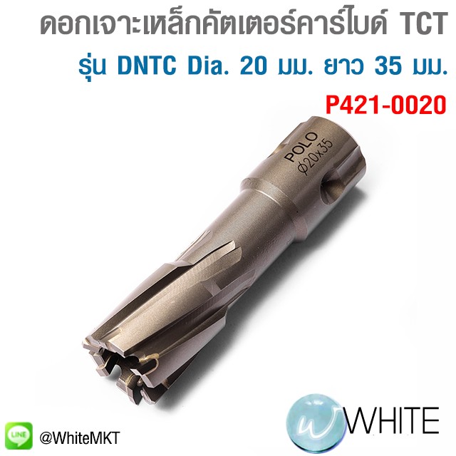 ดอกเจาะเหล็กคัตเตอร์คาร์ไบด์ TCT รุ่น DNTC ขนาดเส้นผ่าศูนย์กลาง 20 มม. ความยาว 35 มม. เจาะได้ลึกสูงสุด 35 มม. สามารถเจาะเหล็กได้แม่นยำ ใช้ได้กับสว่านแท่นแม่เหล็กทุกยี่ห้อ รุุ่น P421-0020 ยี่ห้อ POLO