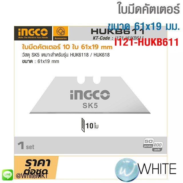 ใบมีดคัตเตอร์ ขนาด 61x19 มม. รุ่น HUKB611 ผลิตจากวัสดุ SK5 จำนวน 10 ใบ/ชุด รุ่น I121-HUKB611 ยี่ห้อ INGCO