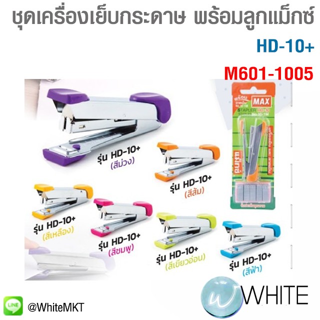 ชุดเครื่องเย็บกระดาษ พร้อมลูกแม็กซ์ No. 10-1M จำนวน 1 กล่อง รุ่น HD-10+ เย็บกระดาษได้หนา 15 แผ่น (กระดาษ 80 แกรม) ความลึกในการเย็บ 5.5 มม. บรรจุลวดเย็บได้ 50 เข็ม รุ่น M601-1005 ยี่ห้อ MAX