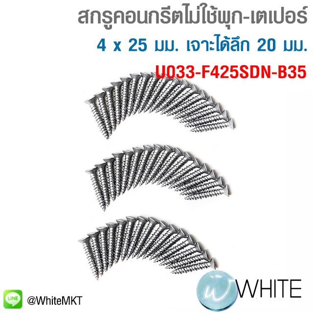 สกรูยึดคอนกรีตไม่ใช้พุก ขนาด 4 x 25 มม. หัวเตเปอร์ (F) เจาะได้ลึก 20 มม. ความกว้างของรูเจาะ 3.5 มม. รับน้ำหนักได้ถึง 220 กก. รุ่น U033-F425SDN-B35 ยี่ห้อ UNIKA