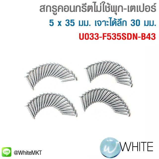 สกรูยึดคอนกรีตไม่ใช้พุก ขนาด 5 x 35 มม. หัวเตเปอร์ (F) เจาะได้ลึก 30 มม. ความกว้างของรูเจาะ 4.3 มม. รับน้ำหนักได้ถึง 350 กก. รุ่น U033-F535SDN-B43 ยี่ห้อ UNIKA