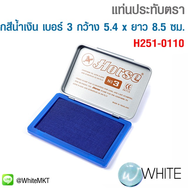 แท่นประทับตรา หมึกสีน้ำเงิน เบอร์ 3 กว้าง 5.4 x ยาว 8.5 ซม. สีสวยคมชัด แห้งเร็ว ติดทนนาน น้ำหมึกปลอดสารตะกั่ว ไม่กัดเนื้อยางให้เสียหาย เหมาะสำหรับใช้งานร่วมกับ ตราประทับ และตรายางชนิดต่างๆ รุ่น H251-0110 ยี่ห้อ HORSE