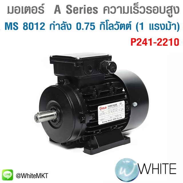 มอเตอร์ (A Series) ชนิดความเร็วรอบสูง รุ่น MS 8012 กำลัง 0.75 กิโลวัตต์ (1 แรงม้า) 3 เฟส 380 โวลต์ 2 โพล 3 สาย IP55 ความเร็วรอบ 2,900 RPM (รอบต่อนาที) รุ่น P241-2210 ยี่ห้อ POLO