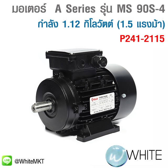 มอเตอร์ (A Series) รุ่น MS 90S-4 กำลัง 1.12 กิโลวัตต์ (1.5 แรงม้า) 3 เฟส 380 โวลต์ 4 โพล 3 สาย IP55 ความเร็วรอบ 1,450 RPM (รอบต่อนาที) รุ่น P241-2115 ยี่ห้อ POLO