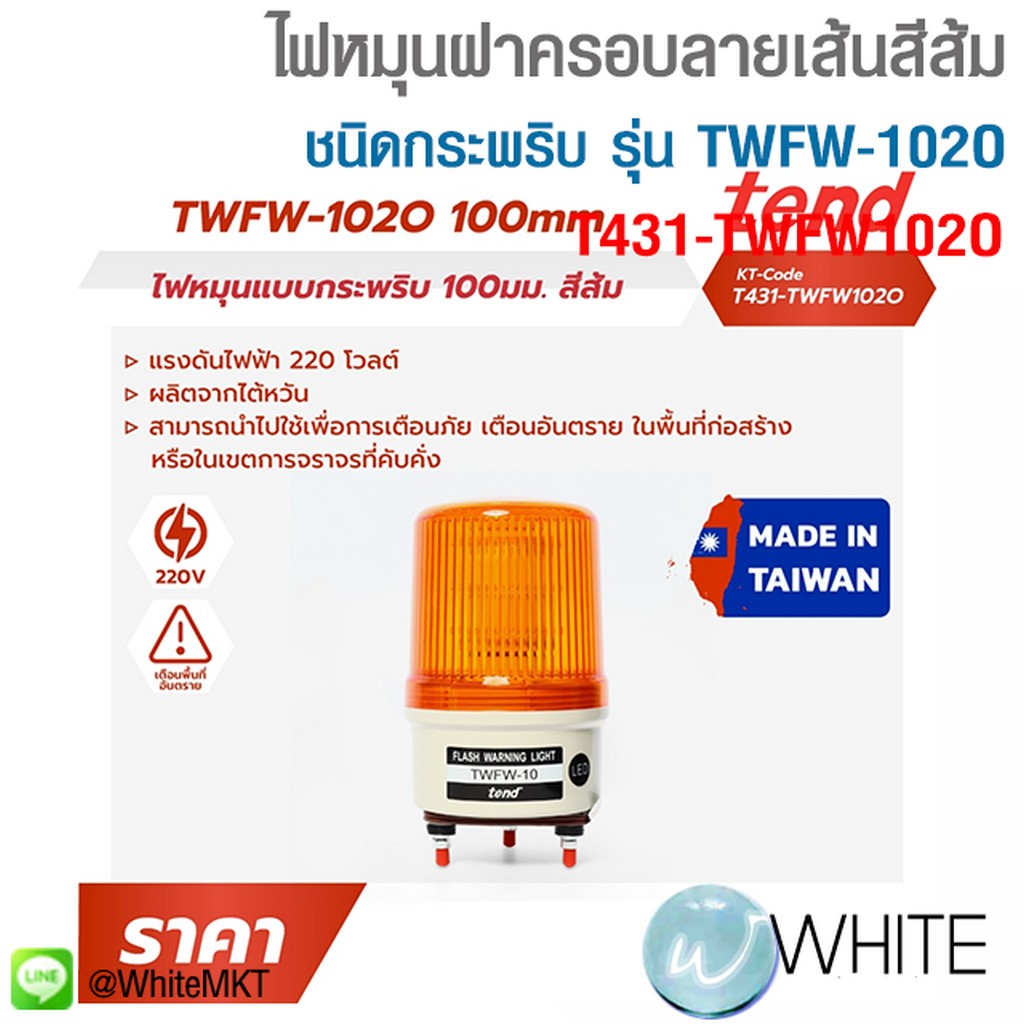 ไฟหมุนฝาครอบลายเส้นสีส้ม ชนิดกระพริบ รุ่น TWFW-102O ขนาด 100 มม. แรงดันไฟฟ้า 220 โวลต์ ผลิตจากไต้หวัน ใช้เพื่อการเตือนภัย เตือนอันตราย ในพื้นที่ก่อสร้าง หรือ ในเขตการจราจรที่คับคั่ง รุุ่น T431-TWFW102O ยี่ห้อ TEND