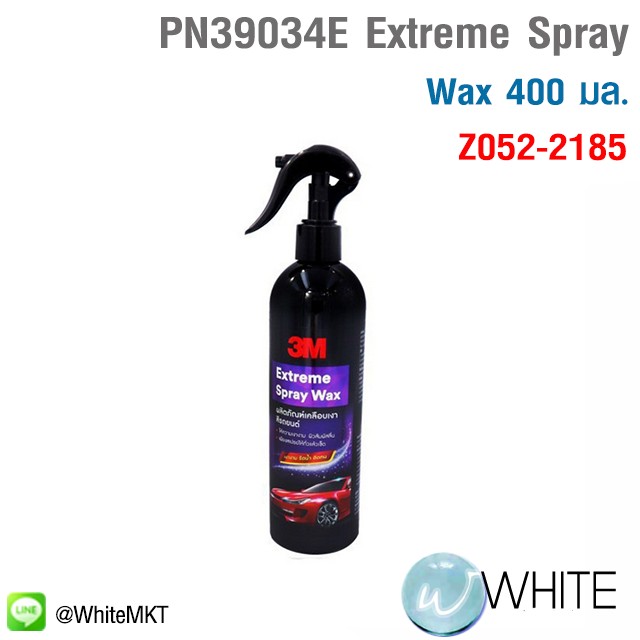 PN39034E Extreme Spray Wax 400 มล. สเปรย์เคลือบเงาสีรถยนต์ เพิ่มความเงางามให้กับพื้นผิวสีรถ มีส่วนผสมของคานูบาเพื่อให้ความเงาฉ่ำลึก ให้ผิวสัมผัสลื่น เพิ่มประสิทธิภาพการรีดน้ำ เม็ดน้ำกลมขึ้น ทดทาน ใช้งานง่าย ฉีดแล้วเช็ด ไม่ควรใช้บนกระจกรถ รุุ่น Z052-2185 ยี่ห้อ 3M