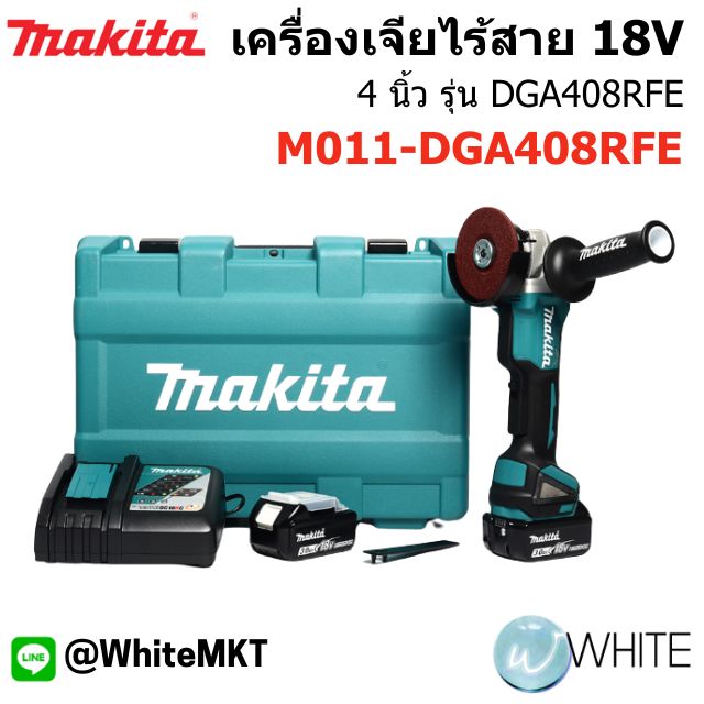 เครื่องเจียไร้สาย 18 โวลต์ ขนาด 4 นิ้ว รุ่น DGA408RFE ความเร็วรอบตัวเปล่า 8,500 รอบ/นาที รวมแบตเตอรี่และแท่นชาร์จ (มากีต้า) รุ่น M011-DGA408RFE ยี่ห้อ MAKITA