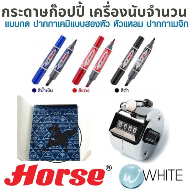 กระดาษก๊อปปี้ กระดิ่งตั้งโต๊ะ เครื่องนับจำนวน ปากกาเคมีแบบสองหัว ปากกาเมจิก ยี่ห้อ HORSE